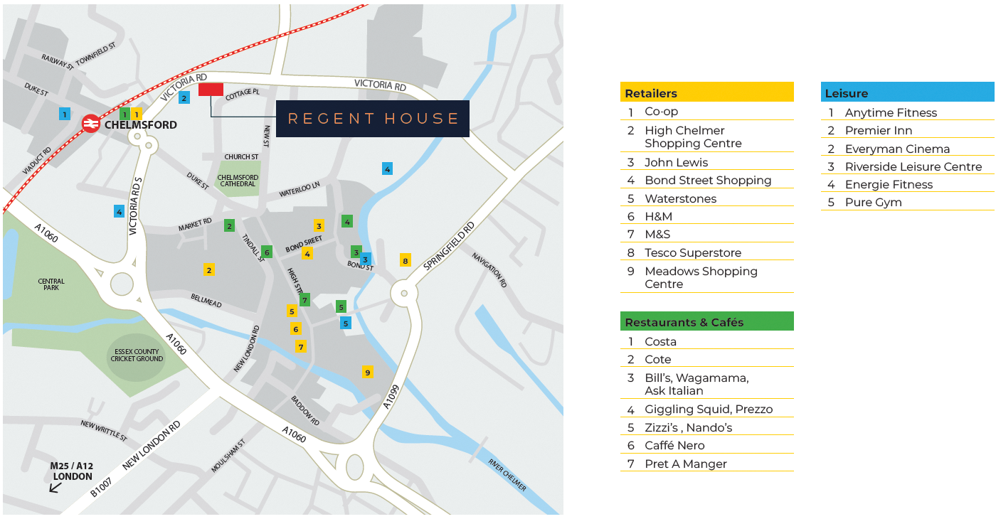 The building benefits from extremely strong sustainability credentials and offers the highest specification of office accommodation within the city centre. Regent House lies adjacent to Chelmsford railway station which provides strong transport links into London Liverpool Street station in 32 minutes.