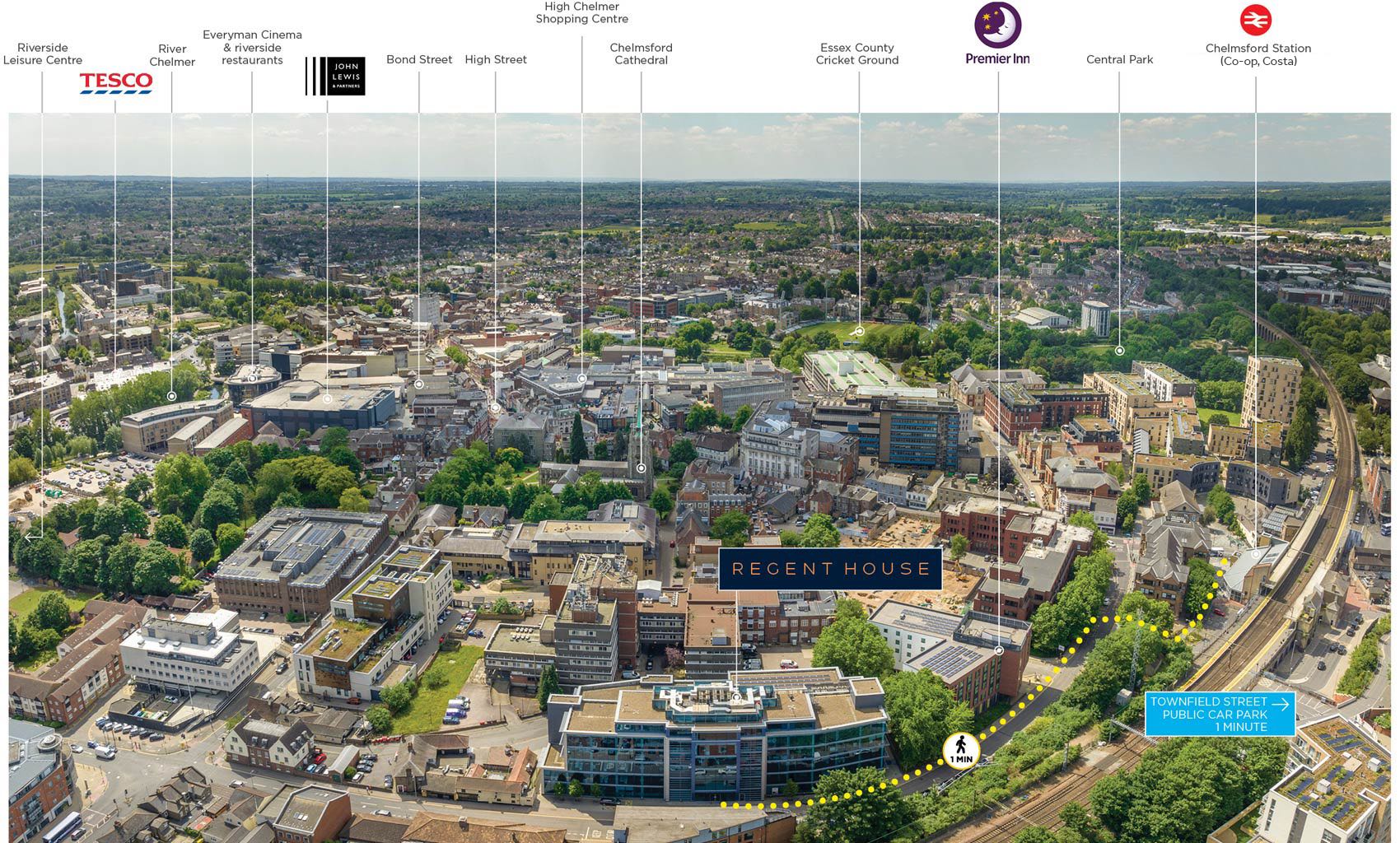 The building benefits from extremely strong sustainability credentials and offers the highest specification of office accommodation within the city centre. Regent House lies adjacent to Chelmsford railway station which provides strong transport links into London Liverpool Street station in 32 minutes.